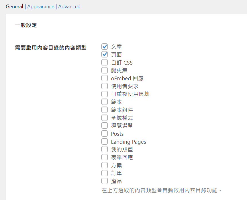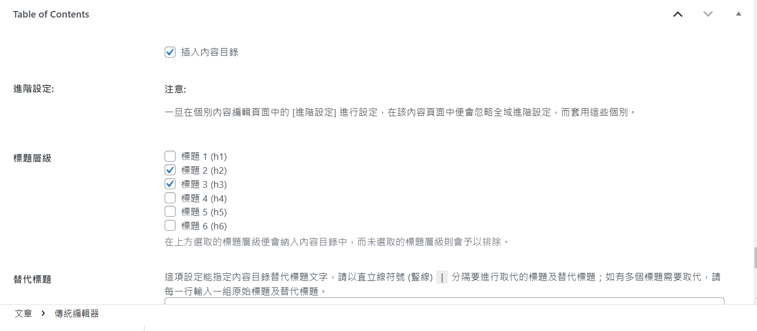 使用的時候很簡單,即在寫文章的頁面拉至底處即可以看到table of contens選項,依據選項可以自由選擇要設置的標題設定