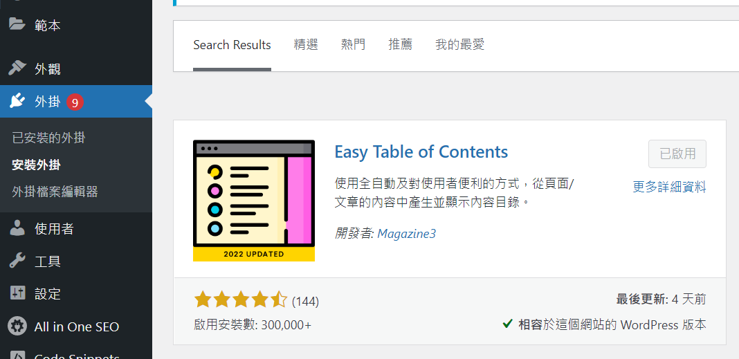 首先至wordpress 安裝外掛的地方搜尋關鍵字 Easy table of contents